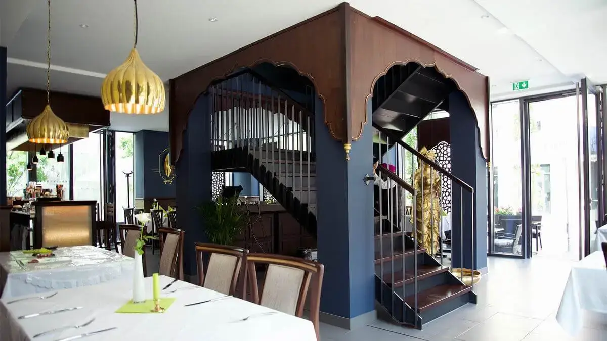 Gastraum des Indian Crown mit Treppenhaus in indischer Architektur