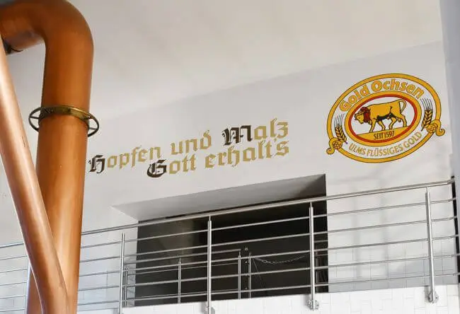 "Hopfen und Malz, Gott erhalts" als Spruch auf einer Wand in der Gold Ochsen Brauerei Ulm