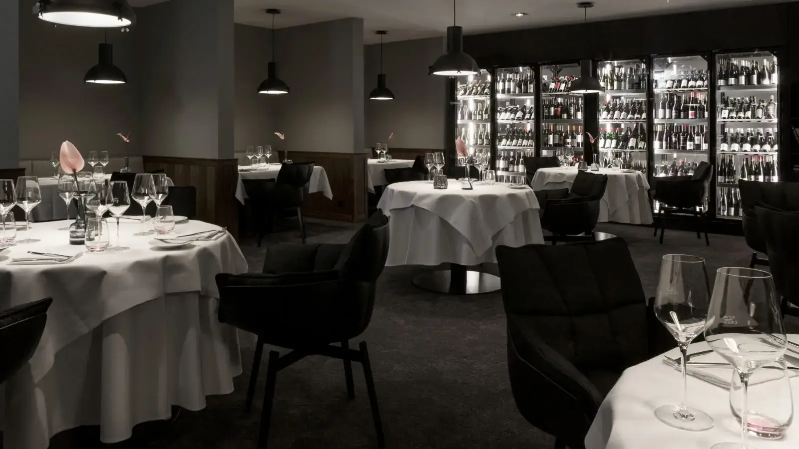 Innenraum des Restaurants Siedepunkt mit großem offenen Weinkühlschrank