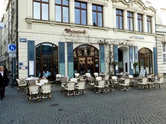 Außenansicht des Restaurants Weinstock in Leipzig mit einladender Bestuhlung